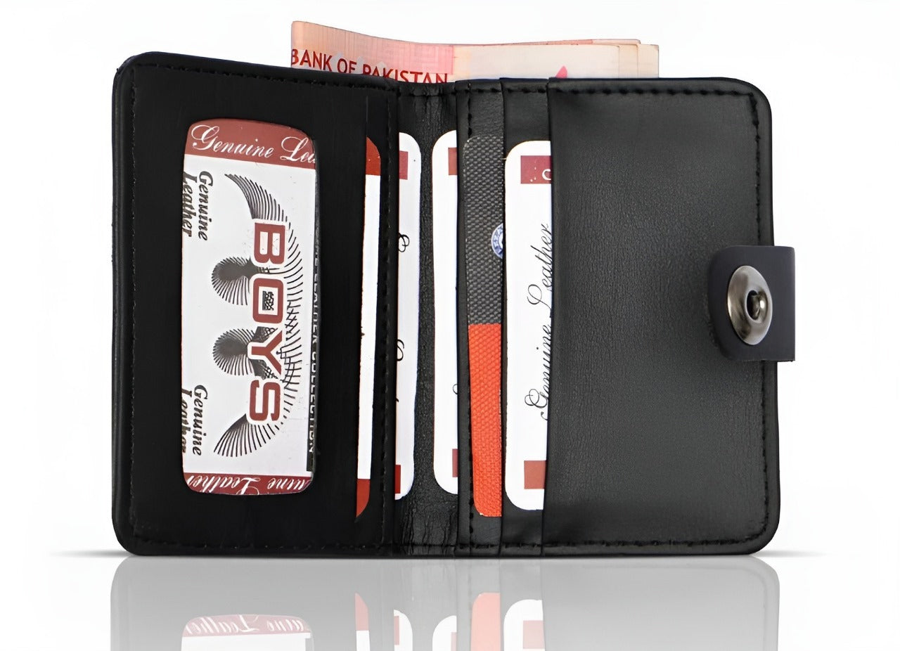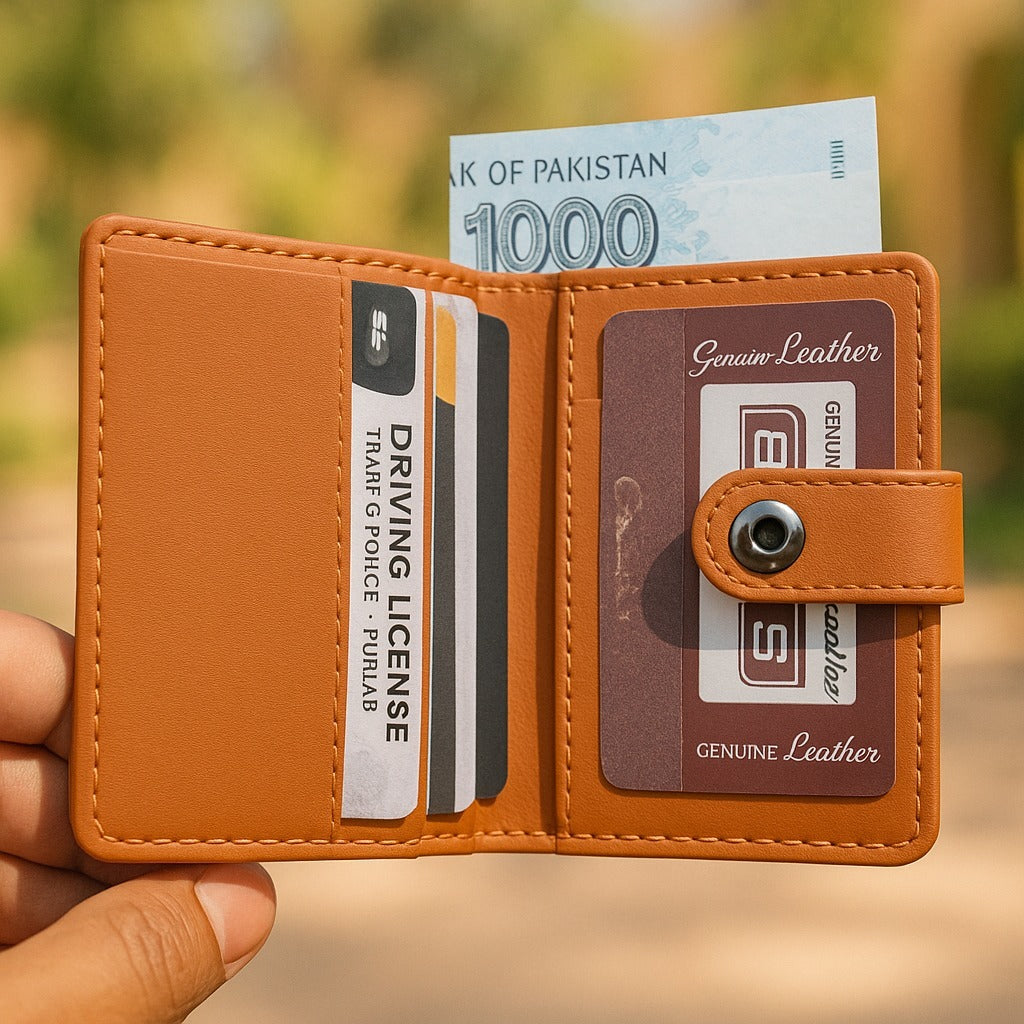 Stay organized with the Premium Bifold Mini Wallet, crafted from high-quality synthetic leather. Designed for everyday use, this slim wallet features multiple card slots, a cash compartment, an ID window, and a secure button closure. Lightweight yet stylish, it's the perfect choice for those who want practicality without compromising on style
